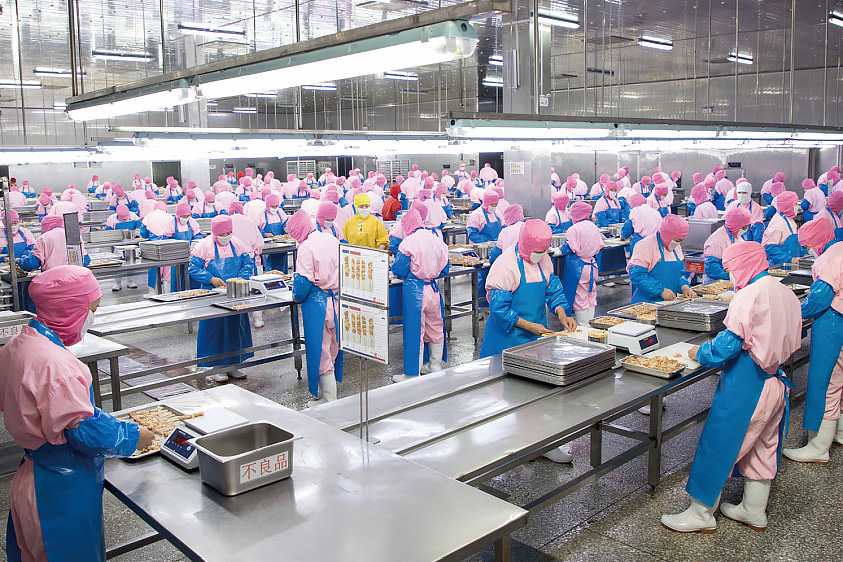 走进禾丰旗下的沈阳华康新新食物无限公司,一只只屠宰后的“禾丰鸡”被送入食物加工车间,颠末朋分、切块、烤制等一系列工序,各类鸡肉熟食络绎不绝下线,打包发往韩国。
