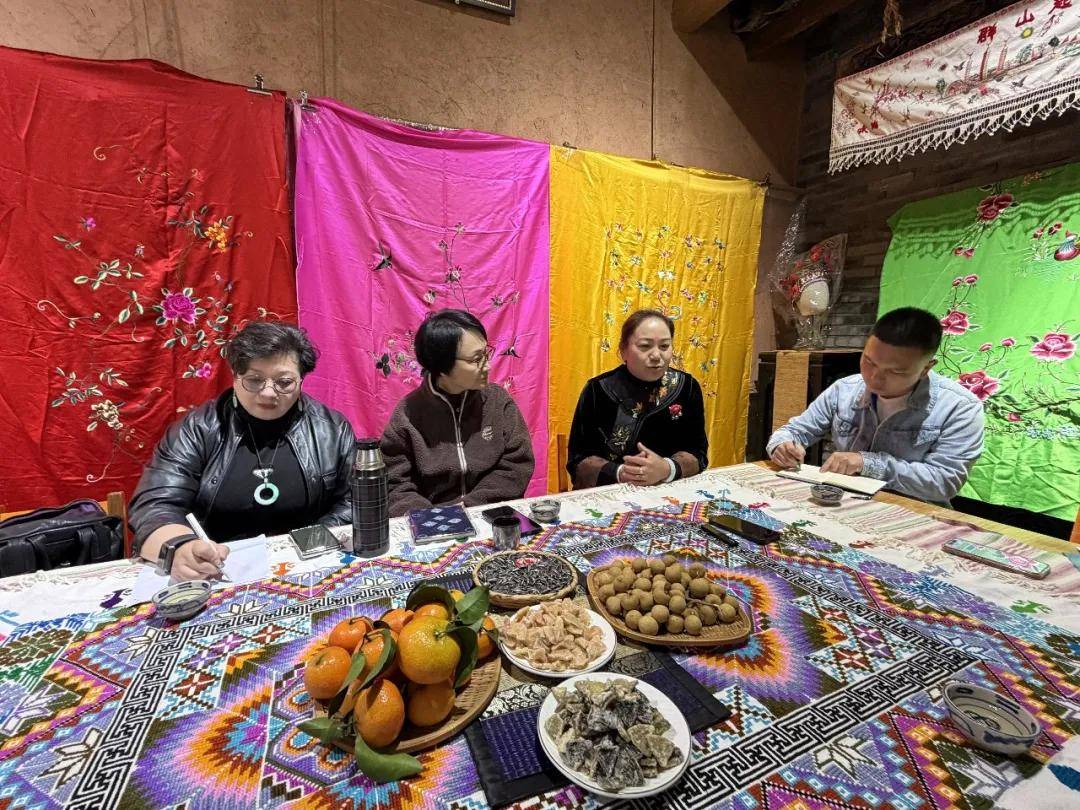 2025年11月14日,巴莫曲布嫫(左二)正在云南省大理市喜洲镇周城村白族刺绣市级代表性传承人杨美池。