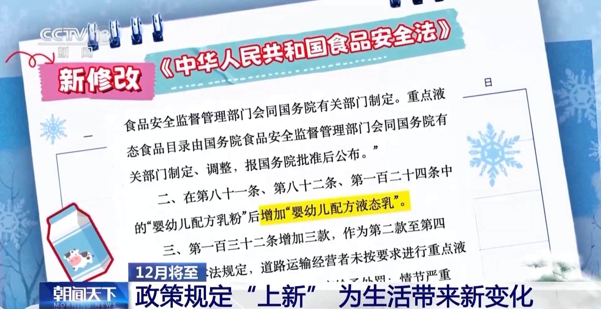 12月的第一个“新”,来自每小我都离不开的餐桌。新点窜的食物平安法12月1日起施行。此次,法令对液态食物的管控愈加严酷,对沉点液态食物道散拆运输实行许可轨制。让食用油、调味料这些家家都有的工具,从运输到上桌,都能查获得链条。婴长儿配方液态乳初次被纳入注册办理。从锅里的油到奶瓶里的奶,每一步都更通明。